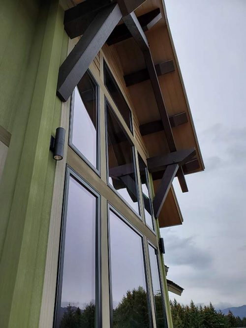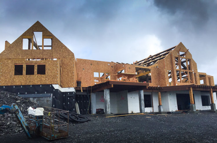 sits on a cliff overlooking Chiniak Bay. Timberbuilt hybrid design combines timbers with SIPs, pre-insulated wall and roof panels, air-sealed during install and engineered for extreme energy efficiency.