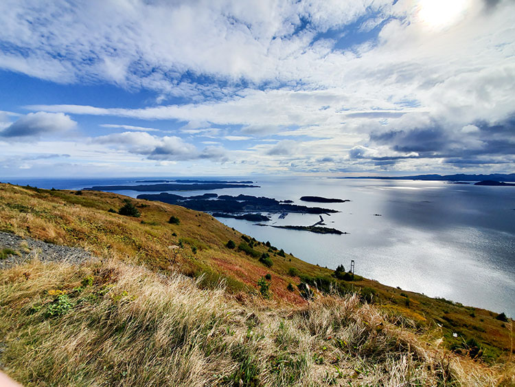 faces Womens Bay and the city of Kodiak. Occasional low-flying air traffic (Hercules C-130s and Jaybird helicopters) from the nearby Coast Guard station ads to the otherworldly views of the landscape.