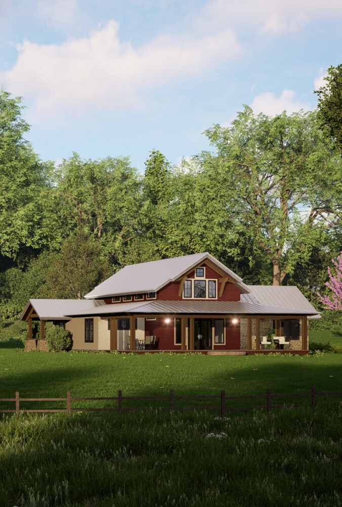 The two wrap-around porches, on opposite sides of the home, are accessed through doorways in the kitchen and the great room.